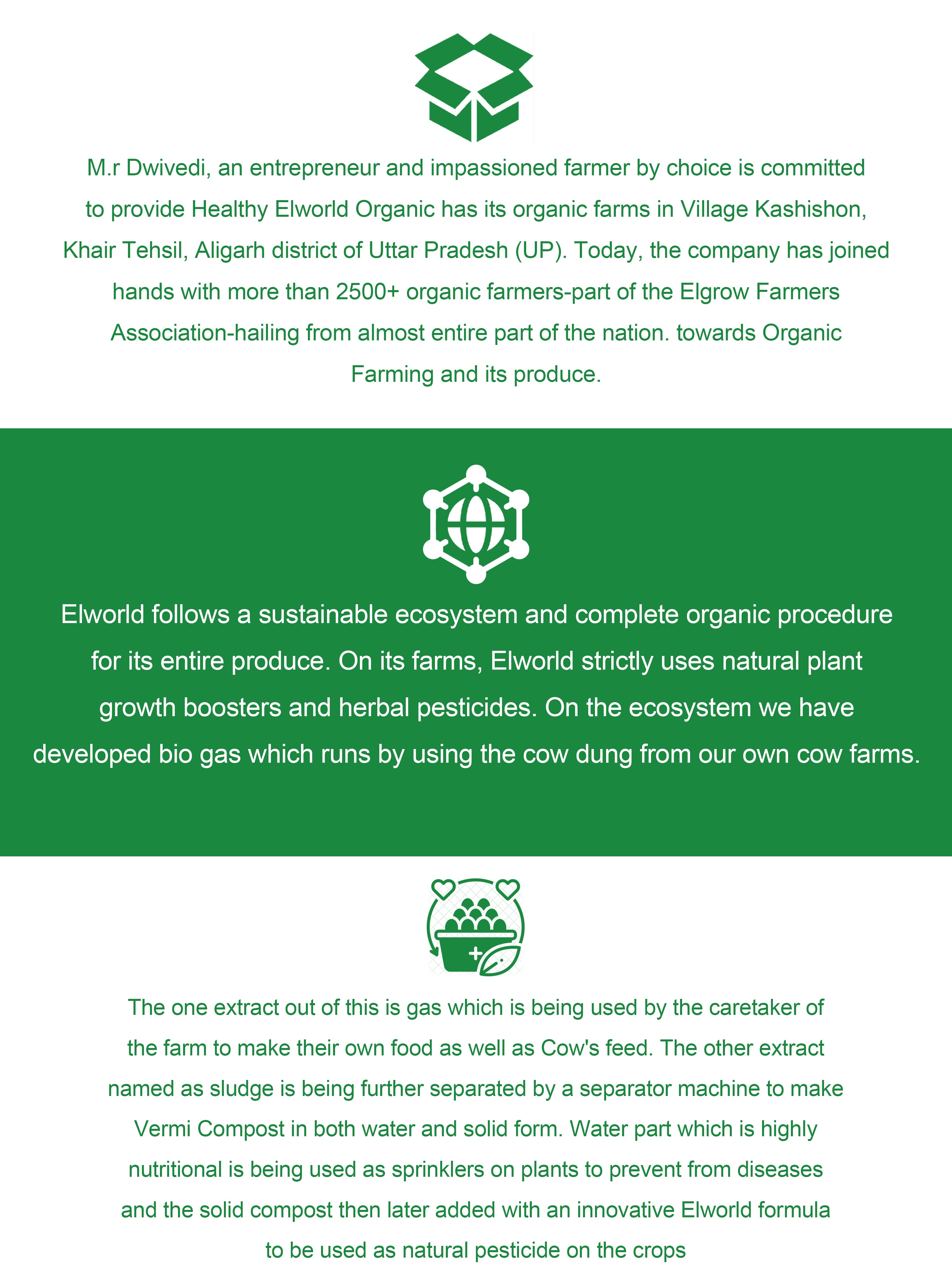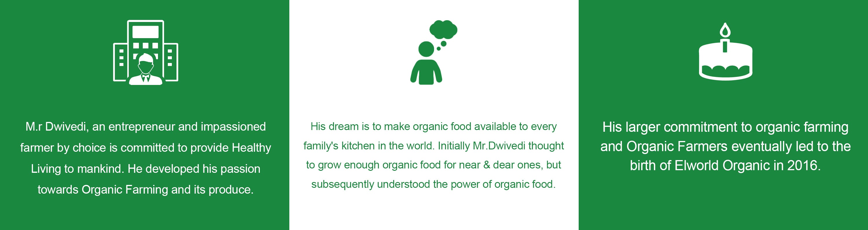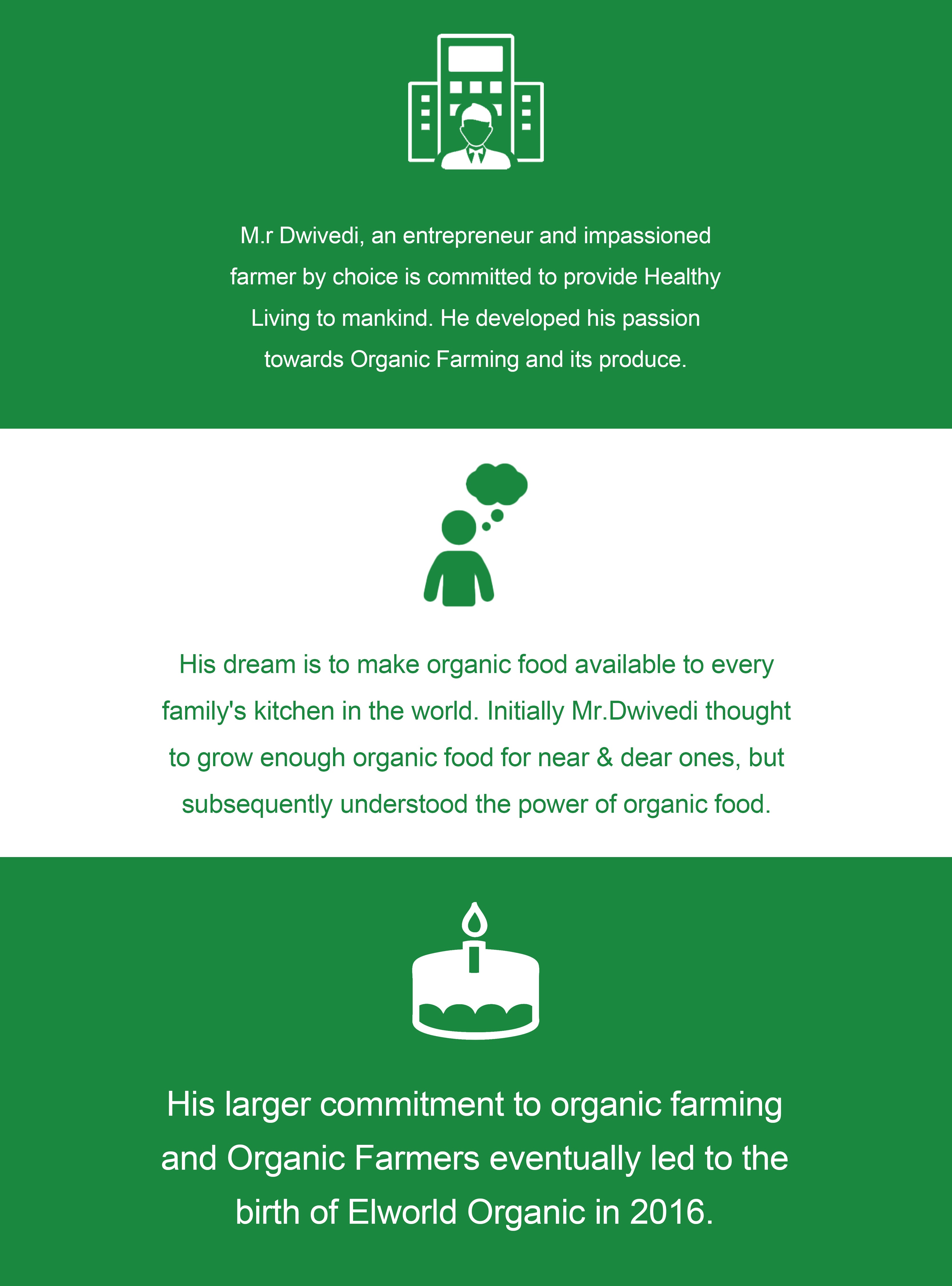 Mr. Dwivedi, an entrepreneur and impassioned farmer by choice, is committed to providing healthy living to mankind. He developed his passion towards organic farming and its produce. His dream is to make organic food available to every family's kitchen in the world. Initially, Mr. Dwivedi aimed to grow enough organic food for near and dear ones, but he subsequently understood the power of organic food. His larger commitment to organic farming and organic farmers eventually led to the birth of Elworld Organic in 2016.